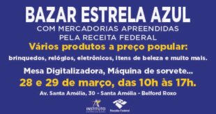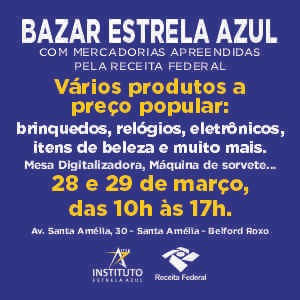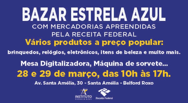 PRIMEIRO BAZAR ESTRELA AZUL / ITEA ⭐Mercadorias apreendidas pela Receita FederalCompartilhe com todo mundo da sua rua, do seu bairro e da sua cidade! 📢Esse bazar é para toda a comunidade!🗓 Dias: 28 e 29 de março de 2026⏰ Horário: das 10h às 17hPrepare-se para um BAZAR COM MUITAS PROMOÇÕES …